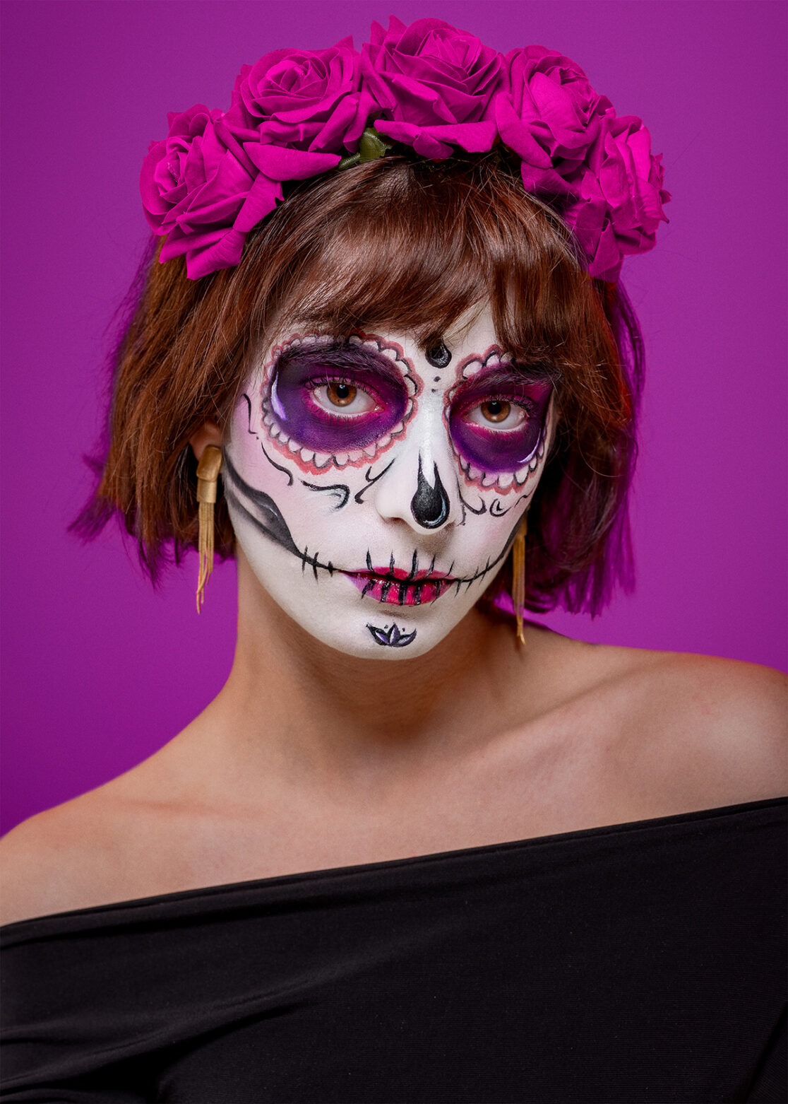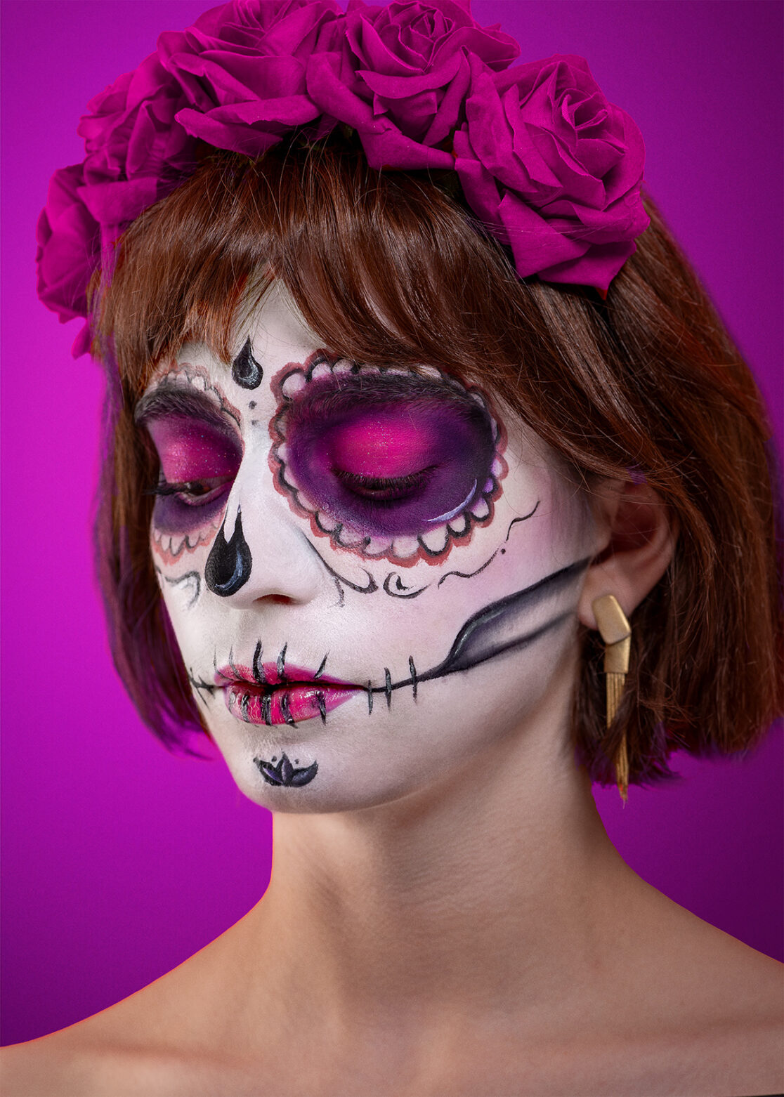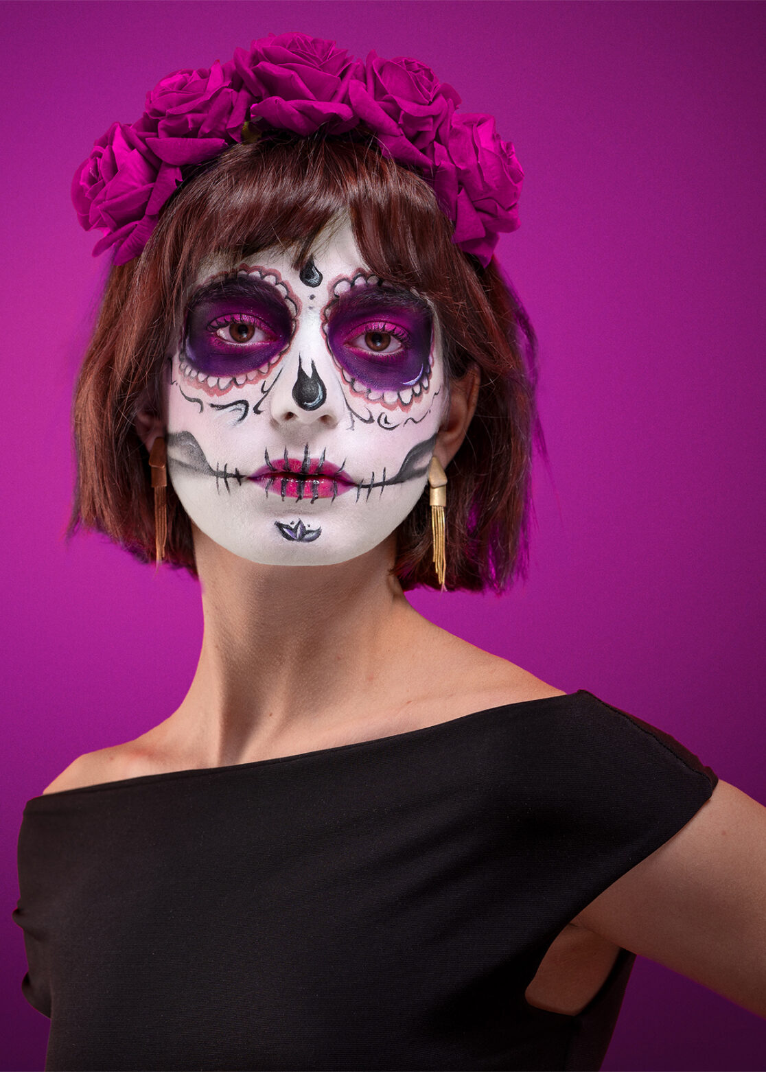 Día de las Muertas est une série qui s’inspire de l’esthétique traditionnelle des maquillages des catrinas* du Día de los Muertos, tout en y apportant une approche plus personnelle à travers un travail sur la couleur. Pour chaque modèle une teinte dominante, choisie pour renforcer l’identité et l’émotion dégagée par le modèle.